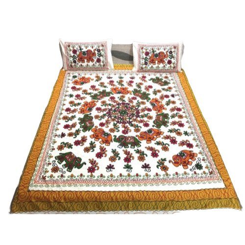 Vibrant floral printed bedcover with colorful patterns and white thread kantha embroidery